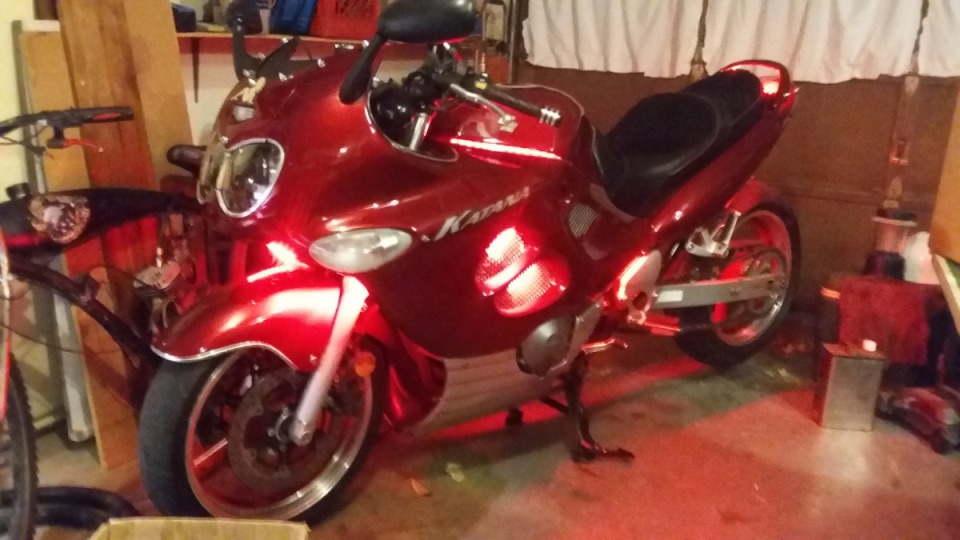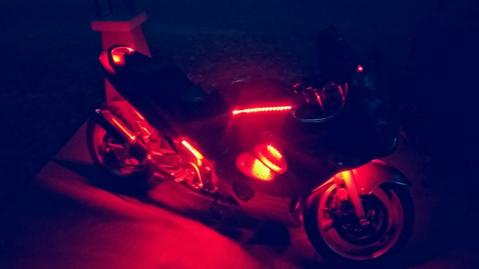 I love my bike, she is an older bike but is very unique. She is stretched 11 in. and has red led running lights on the bottom as well as red and white multifunction strobe lights and I put a sound system on her that plays mp3's, usb's, and micro sd card r