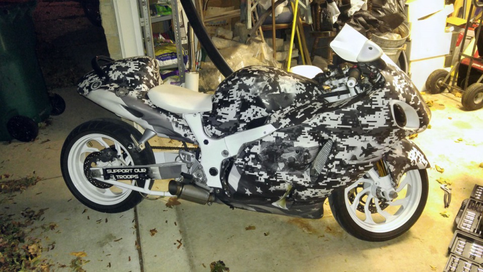 My SnoBird is a full custom build. The bike has been wrapped in a full Military wrap. Artic DigiCamo and Military Images. Everything has been Powder Coated White. Custom 8 inch stretch swingarm. Performance Machine Torque Wheels. Frame. Forks. Triple tree