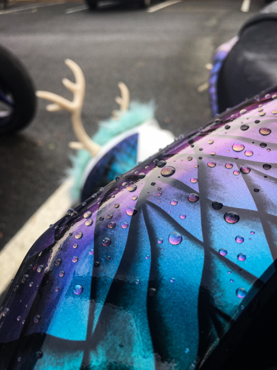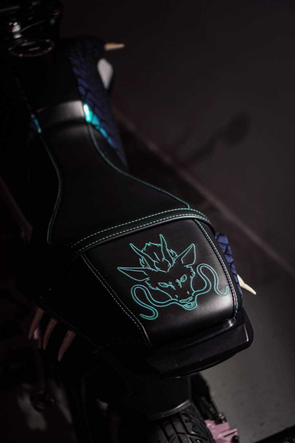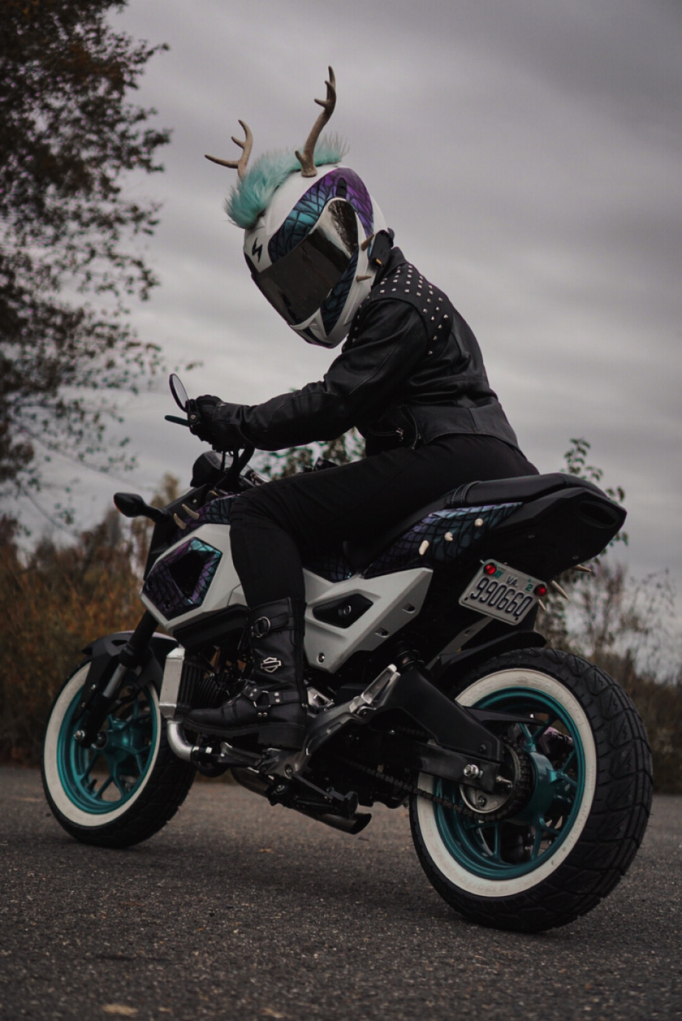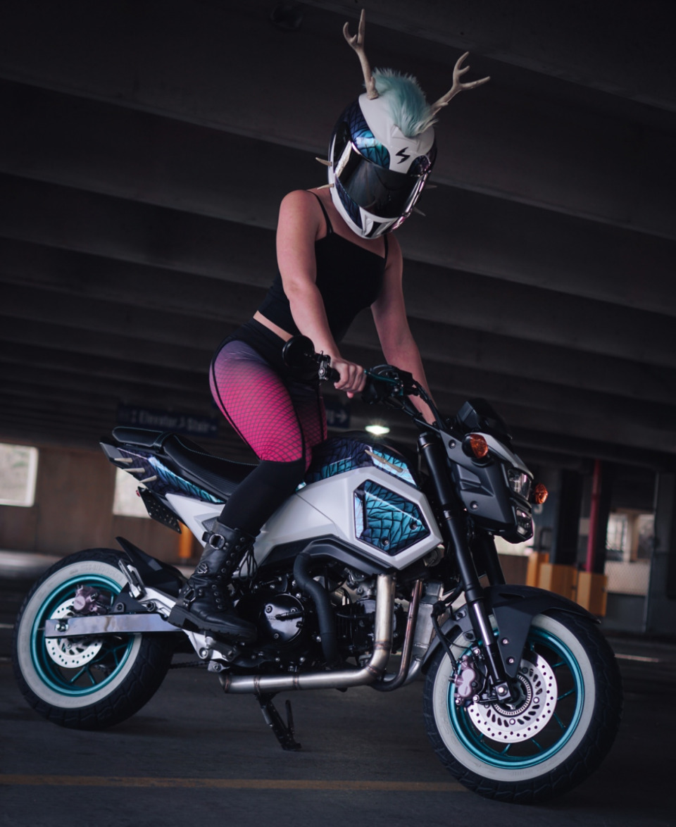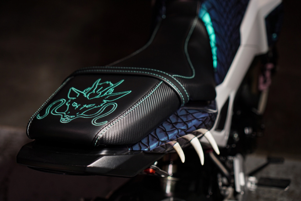 Custom wrap, deer antlers, custom seat with a dragon head, and powder coated calipers, wheels, levers, and soon rear sets.