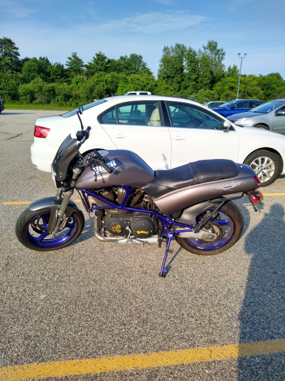 2003 Buell S3T Thunderbolt. I bought this as a basket case, the kid laid it down, then took it apart. It was a fun little winter project. I did have a tuff time finding parts for the Thunderbolt, so the lighting and gauges are for the S2