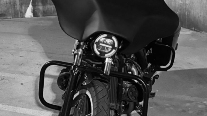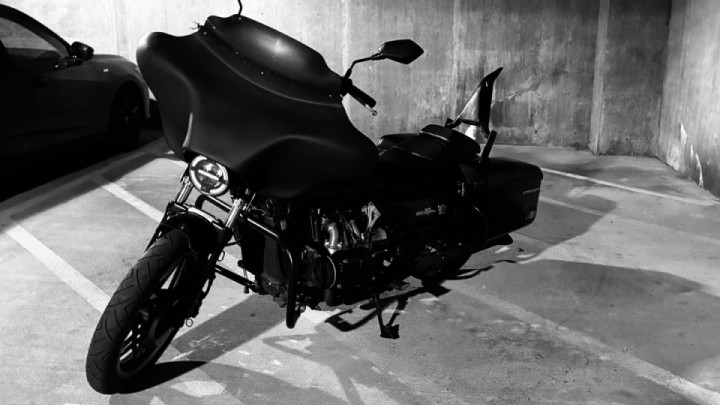 Got her about 16 months ago as a non-running stock ‘81 Interstate. Rebuilt the carbs, removed airbox, stock fairing, air ride and seat. Installed progressive shocks, Sport Glide seat with a few mods, Street Glide crash bar, 12” apes with new grips, batwing fairing and sissy bar. The shocks lowered it about 6”. Installing new radio and cicada speakers this week. Installed LED headlight and recessed taillights along with LED blinkers. Straight pipes for better sound. Blacked out most of the bike.