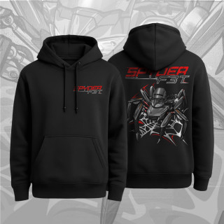 The footrests were moved further to the rear. A custom 4-in-1 exhaust system ends in a GPR rear silencer. Finally, the bike was painted in black and yellow and fitted with the name-giving spider.