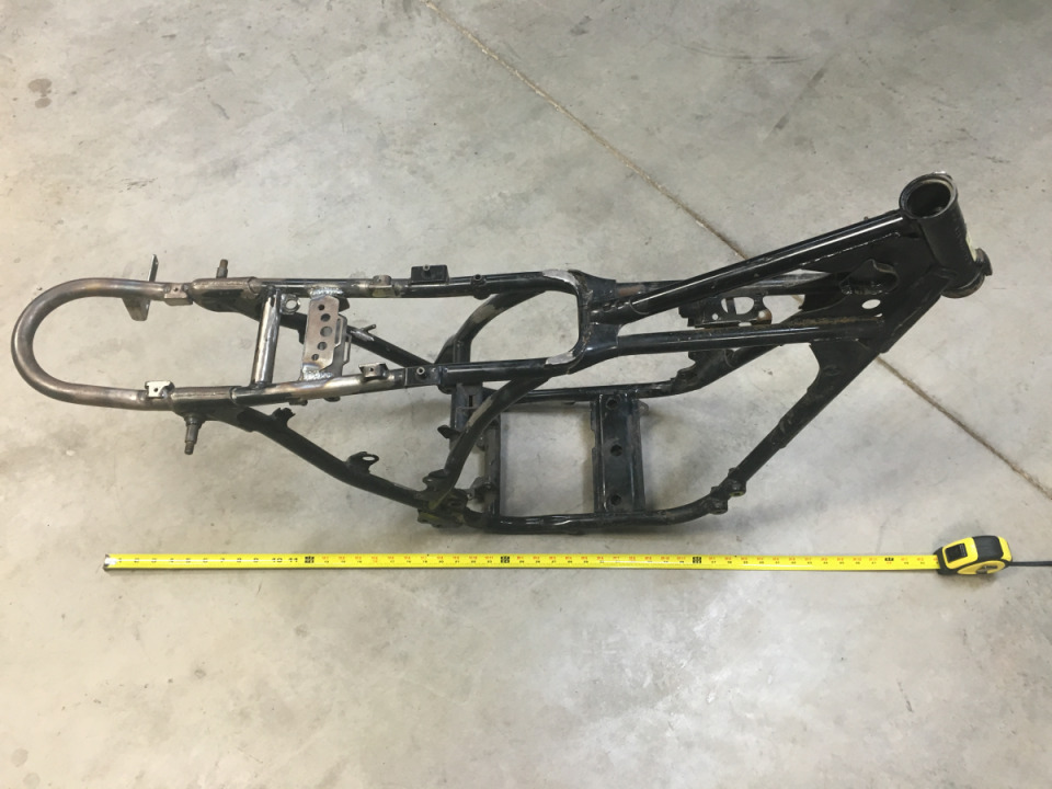 Then all the unused frame tabs and such were chopped off along with the rear end. A custom bent rear hoop and tail section mounting tabs were welded on.