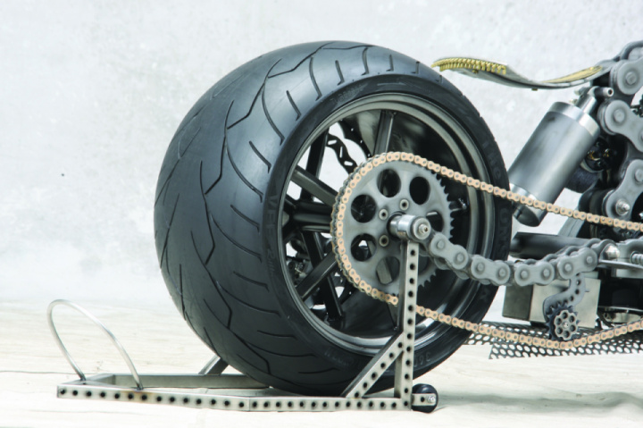 In order to get the project rolling Rafik ordered a set of wheels from Wheels4Choppers; a front 2.5 x 19in and a rear 14 x 18in. In order to cover the wide rear wheel a Vee Rubber 360-section tire was fitted.