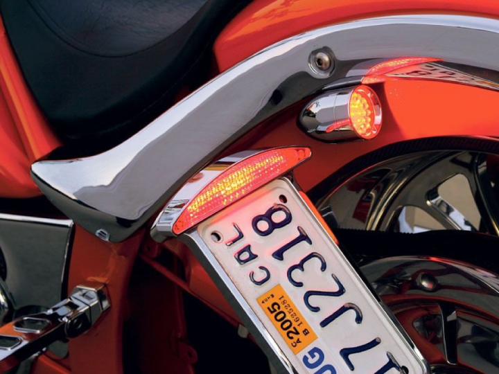 As with most custom projects, once the major chassis and rolling gear modifications are complete, the most challenging part of the building begins—deciding what components to accessorize the new bike with. Garrett took a measured approach with V2K. Rather than swapping every possible part with a chrome replacement from the aftermarket, he left a smattering of OE parts installed. For example, the instrument cluster's bezel and the fender rails are both standard equipment. Sure, he could have changed them, but they looked good with the bike's new lines, so why do it just for the sake of doing it? Instead, he focused on making measured changes to portions of the bike. The handlebar is an L.A. Choppers Z-Bar coupled to a set of Harley-based Arlen Ness switch gear/hand controls and grips. An Aeromach Extreme Oval Mirror mounted to a Slayer provide a stylish but minimalist rear view. A pair of custom-length Barnett cables transmit the rider's input to the engine. (A short note about mixing Harley and metric controls: The ends on the cables are often different, so you have to specify which fittings should be mounted to which end of custom cables.) The finishing touch for the front end was an Adjure seven-inch smooth headlight (which like the Ness grips, came from ) coupled with a set of Lazer Star LED turn signal/running lights from JP Cycles.