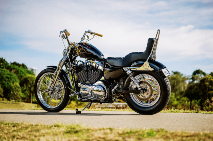 The client wanted the bike to have a lot of chrome with touches of gold, and so a Seventy-Two Sportster (aka the “XL1200V”) was chosen as the starting point due to the abundance of chrome already installed from the Hog factory somewhere deep in the US blue collar heartland. The key aim for the job was to have reliability and the comfy ride of a modern bike but with the look of those classic 70’s-style chopper customs. “The absolute musts in creating a 70’s style bike are the springer front forks, the “Jack & Jill” seat, a sissy bar and a bunch of flames on the tank,” says Bruce.