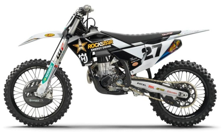 Cosmetic changes: The black and white Rockstar Edition color scheme is much more eye-catching than the yellow and gray plastics on the standard FC450. Additionally, the rear fender and fork protection are white instead of yellow. The radiator shrouds feature the prominent Rockstar logo, while the swingarm displays sponsor logos (Brembo, RK chain, Excel wheels, Haan), front fender (FMF), rear fender (Pro Taper, Dunlop), airbox cover (Twin Air, Paradise Chevy), fork protection (Motorex), and front number plate (Motorex).